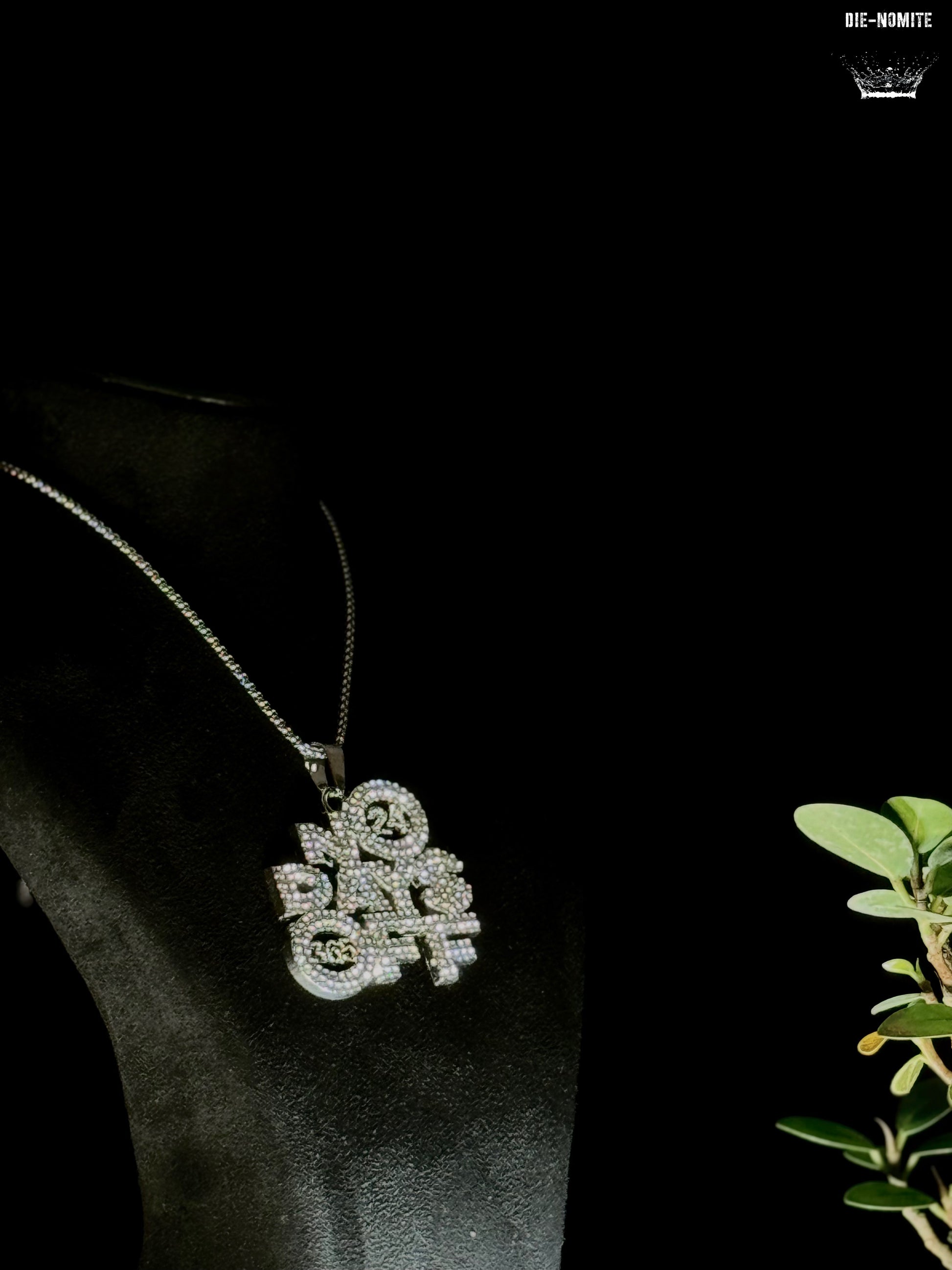 - Pendant: The pendant is a large, silver-toned piece with the words "NO DAYS OFF" spelled out in bold letters. The letters are encrusted with sparkling, clear rhinestones.